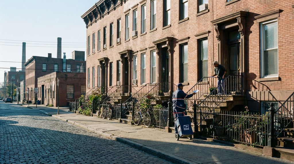 Row of brownstone townhouses in a industrial neighborhood, stoops and front gardens with iron railings, early morning, crisp clear morning light with cool shadows, a mail carrier making deliveries, lived-in urban character, no borders no film frames no letterboxing,.