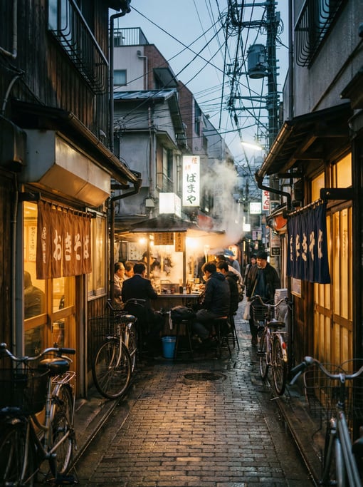 Narrow Japanese backstreet with izakayas with noren curtains hanging in entries, dusk, warm tungsten light from interiors mixing with cool twilight outside, steam rising from a food stall, intimate human-scale urban texture, no borders no film frames no letterboxing,.