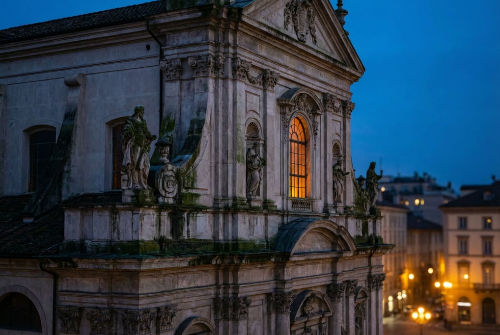 Baroque church facade with carved stone with weathering stains and patina adding character, dusk, deep blue twilight with warm city lights emerging, warm light from a single lit window at night, stark architectural presence, no borders no film frames no letterboxing,.
