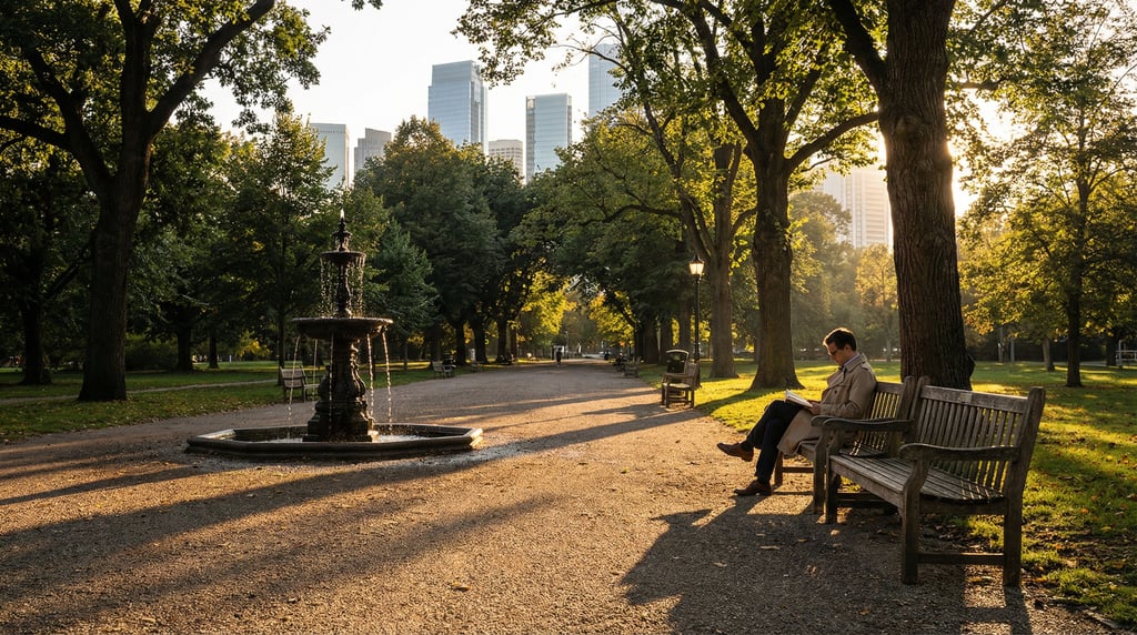Tree-lined park path with city towers visible in the background, a Victorian-era iron fountain, late afternoon, warm raking sunlight creating dramatic shadows on surfaces, a person reading on a bench, the meeting of urban and green space, no borders no film frames no letterboxing,.