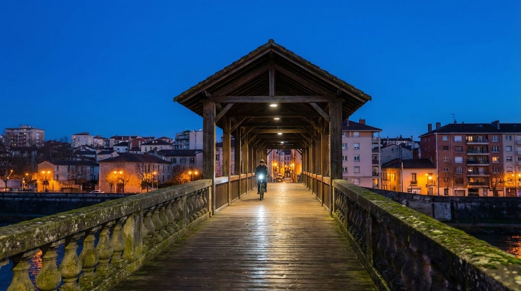 Covered wooden footbridge at blue hour, stone balustrades with weathered moss, deep cobalt sky with warm artificial lights below, a lone cyclist crossing the empty deck, clear sky above, urban infrastructure as architecture, no borders no film frames no letterboxing,.