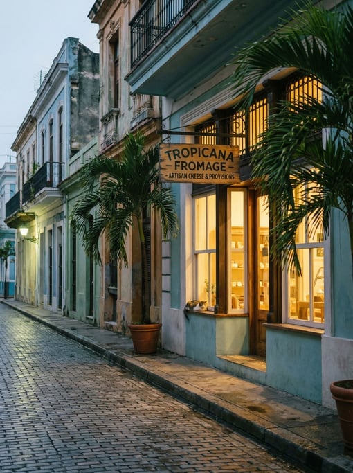 Artisan cheese shop on a quiet tropical city side street, warm light pouring from windows onto the pavement, hand-painted sign above the entrance, dawn, neighboring buildings in muted tones, no borders no film frames no letterboxing,.