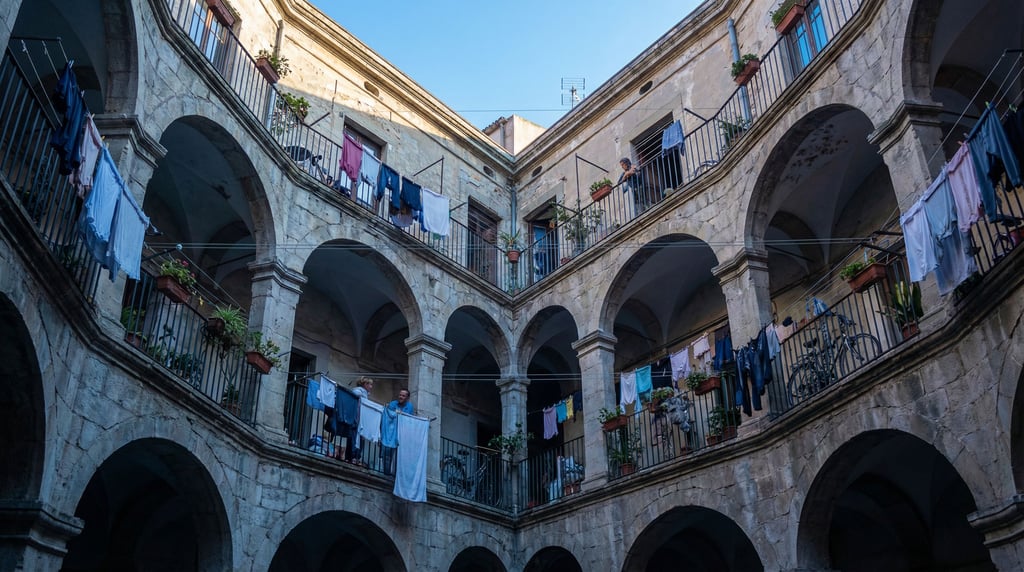 Looking up through a courtyard of a monastery cloister, laundry lines strung between balconies at different levels, blue hour light hitting the upper floors while lower levels sit in cool shadow, everyday urban life, no borders no film frames no letterboxing,.