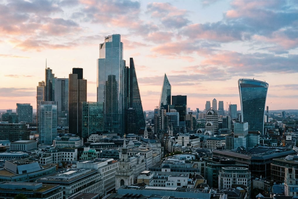 Sweeping panoramic view of a modern glass and steel city skyline at dawn