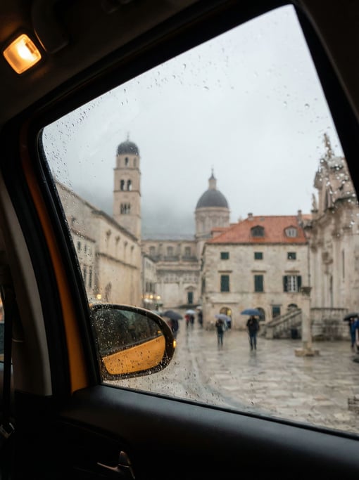 View through a rain-streaked taxi window overlooking a Mediterranean cityscape at misty morning