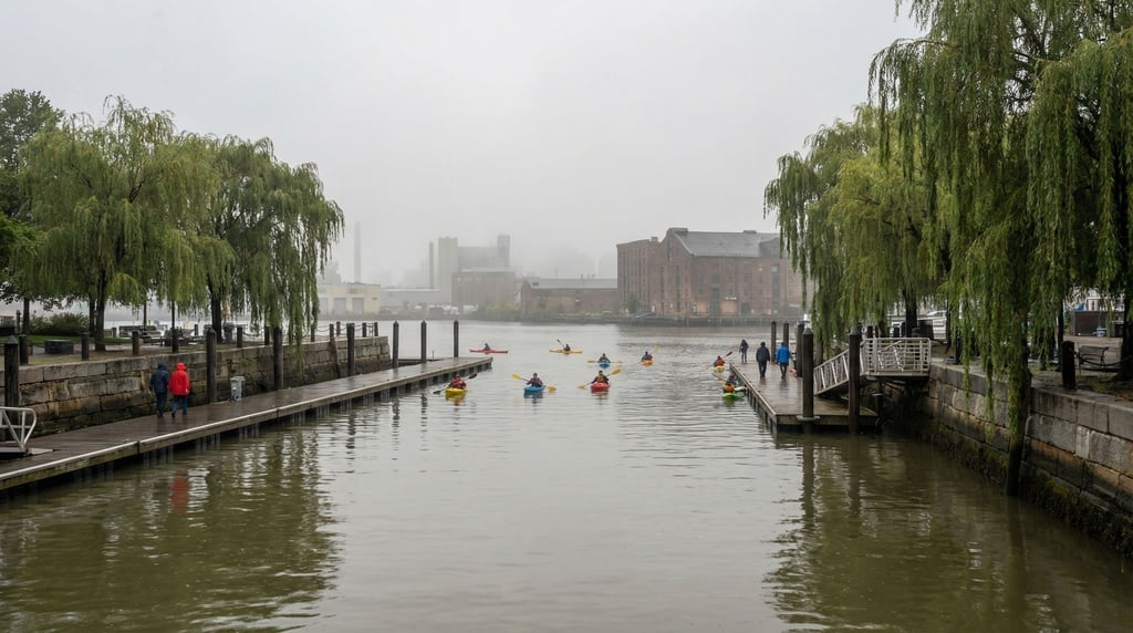 City dock area lined with weeping willows hanging over the water edge, overcast midday, reflections in the water, kayakers paddling past, hazy atmosphere, no borders no film frames no letterboxing,.