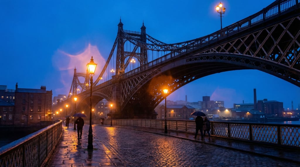 Cast iron Victorian bridge at blue hour, the structure creating a sweeping curve through the composition, deep cobalt sky with warm artificial lights below, commuters with umbrellas hurrying across, hazy atmosphere, urban infrastructure as architecture, no borders no film frames no letterboxing,.
