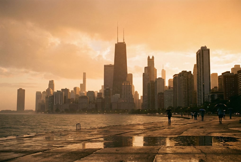 Distant city skyline seen from a lakeside promenade, a mix of heights and architectural eras creating a layered profile, golden hour light creating silhouettes and warm glow, after a rain shower, sense of distance and scale, no borders no film frames no letterboxing,.