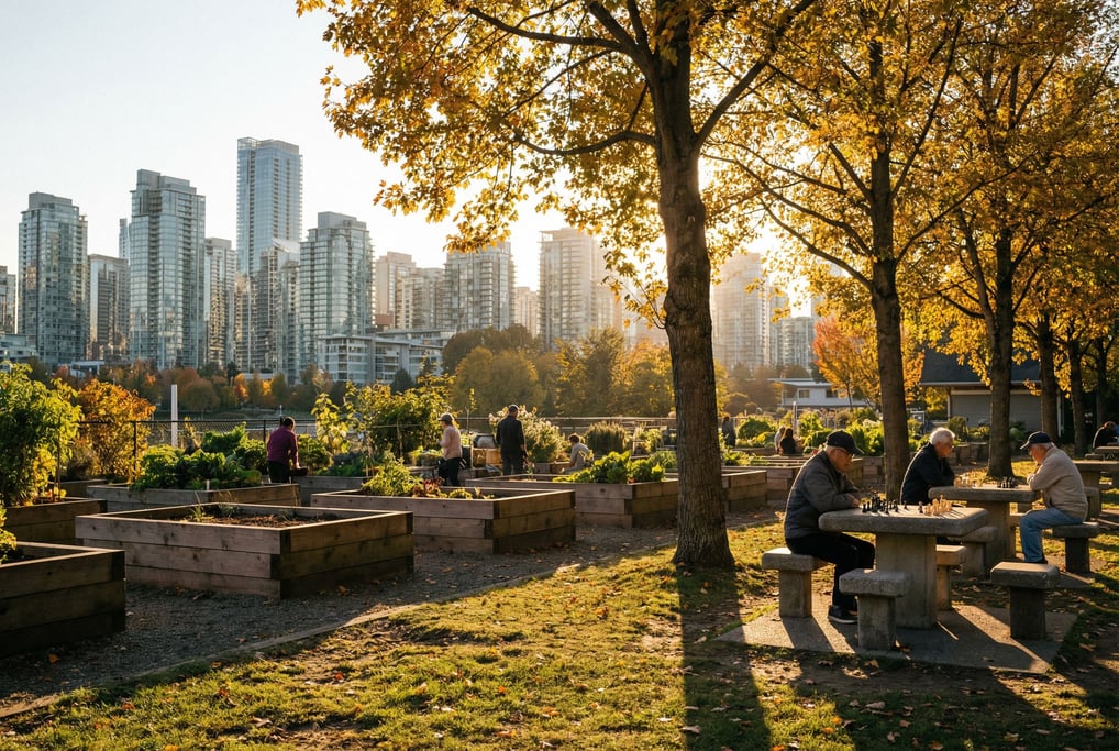 Community garden with raised beds with city towers visible in the background, mature trees with golden autumn foliage, late afternoon, warm raking sunlight creating dramatic shadows on surfaces, elderly people playing chess at stone tables, the meeting of urban and green space, no borders no film frames no letterboxing,.
