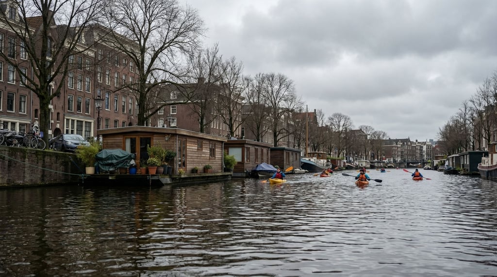 City river embankment lined with houseboats moored along the quay, overcast midday, reflections in the water, kayakers paddling past, overcast grey sky, no borders no film frames no letterboxing,.