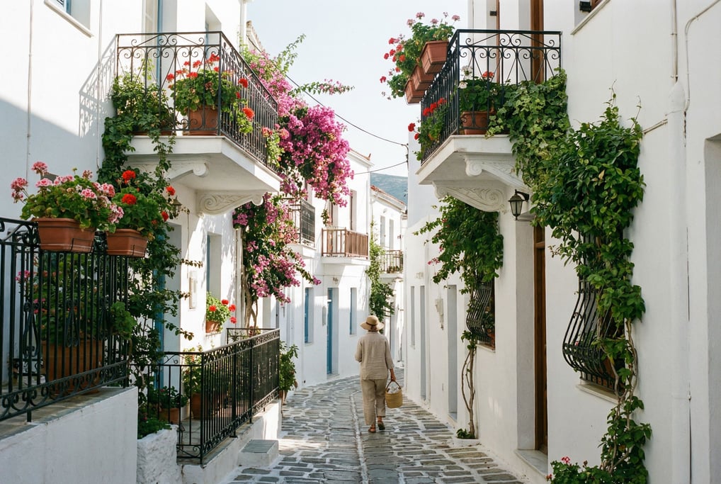 Narrow Greek island whitewashed lane with wrought iron balconies with hanging plants, early morning, crisp clear morning light with cool shadows, a single figure walking away into the distance, intimate urban atmosphere, no borders no film frames no letterboxing,.