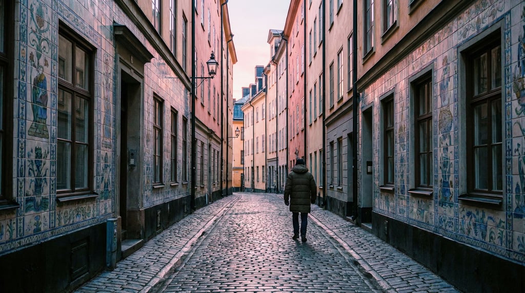 Narrow Stockholm Gamla Stan lane with hand-painted ceramic tiles on building facades, dawn, soft pink and blue pre-sunrise light, a single figure walking away into the distance, intimate urban atmosphere, no borders no film frames no letterboxing,.