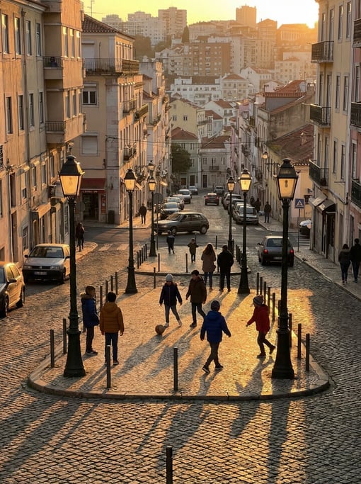 Children playing in a small neighborhood plaza on a steep hillside road in a cosmopolitan city, golden hour, warm amber light casting long shadows, vintage streetlights lining both sides, authentic urban energy, winter light, no borders no film frames no letterboxing,.