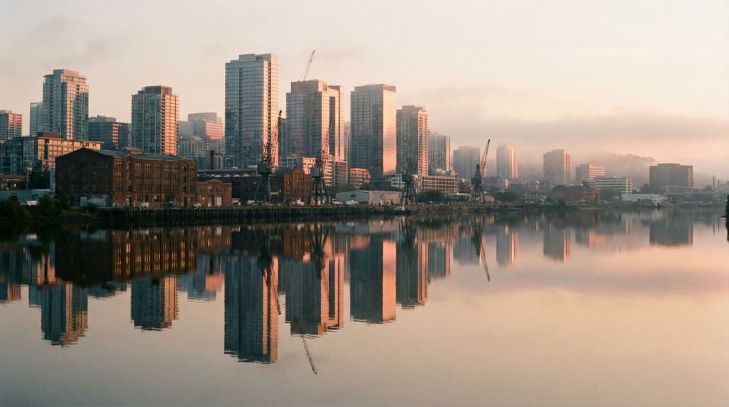 industrial waterfront city skyline reflected in a calm river at sunset, glass towers catching reflected light against the sky, mirror-like water doubling the towers, rich golden-pink light backlighting the scene, light fog softening the background, no borders no film frames no letterboxing,.