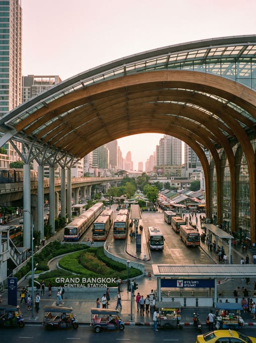Modern transit hub with sweeping roof in a Bangkok