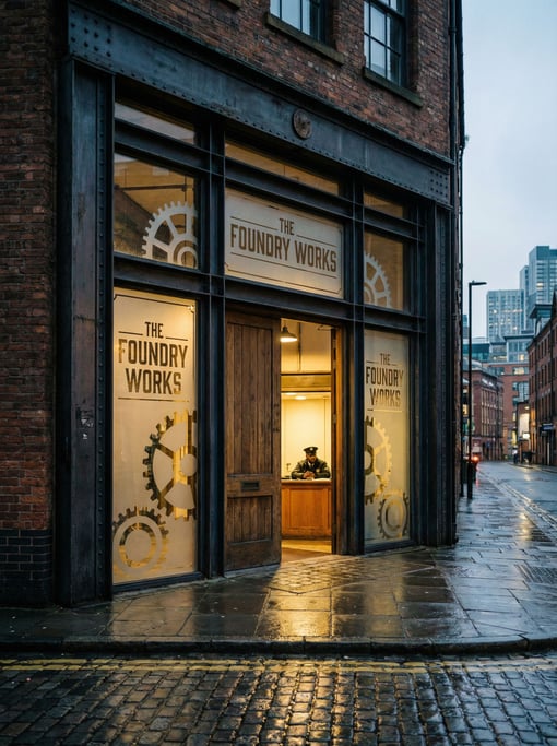 Industrial converted factory entrance with steel frame, etched glass panels flanking the entrance, dusk, warm interior light spilling onto the sidewalk, security guard at the desk inside, urban grandeur, no borders no film frames no letterboxing,.