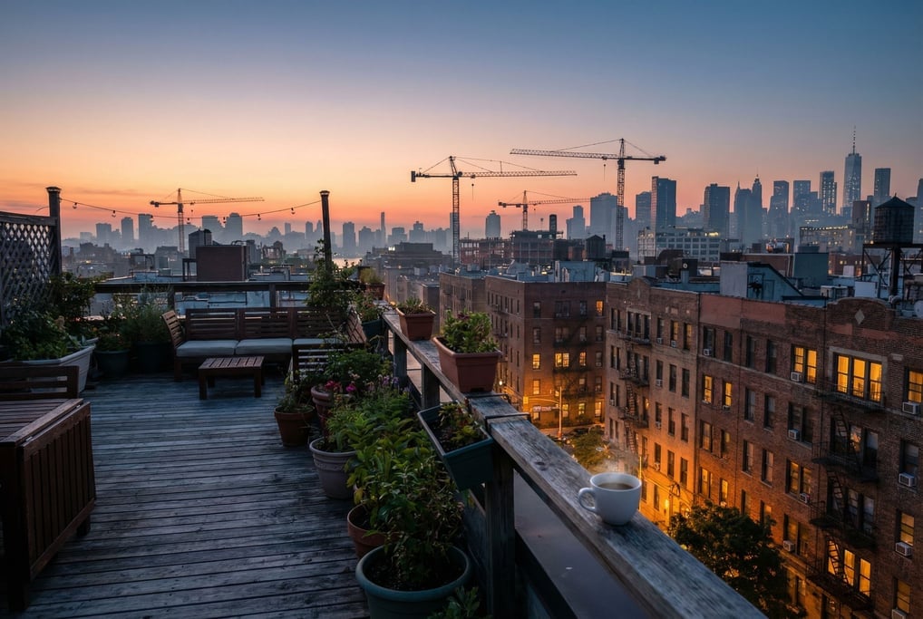 Distant city skyline seen from a residential rooftop terrace, construction cranes silhouetted on the horizon marking urban growth, early morning light creating silhouettes and warm glow, crisp autumn air, sense of distance and scale, no borders no film frames no letterboxing,.
