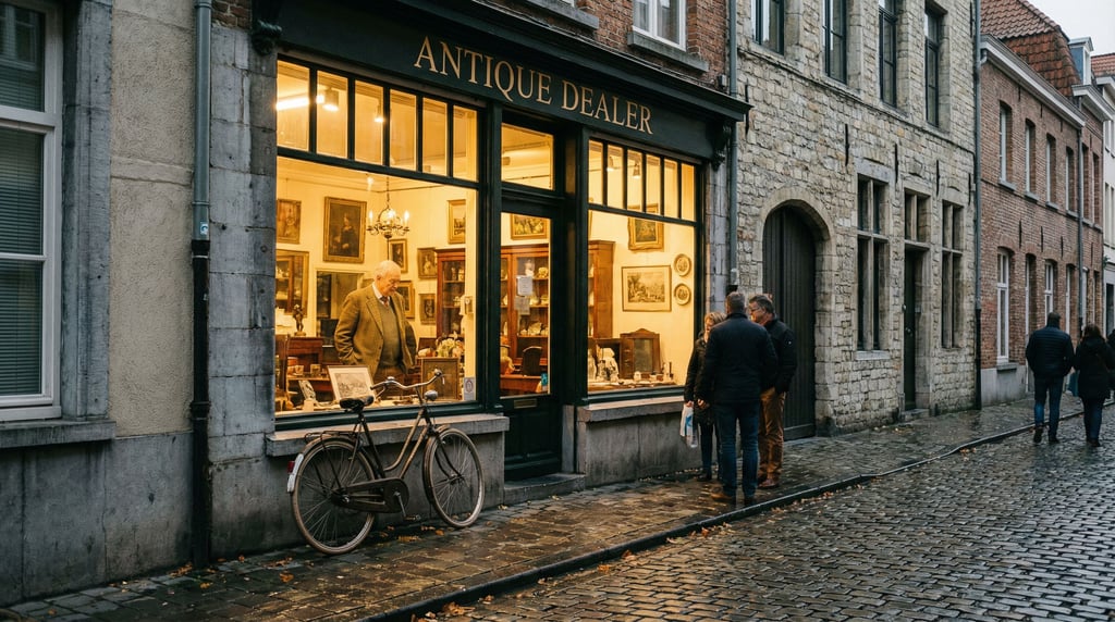 Antique dealer on a quiet northern European city side street, warm light pouring from windows onto the pavement, an old bicycle parked out front, golden hour, neighboring buildings in muted tones, no borders no film frames no letterboxing,.