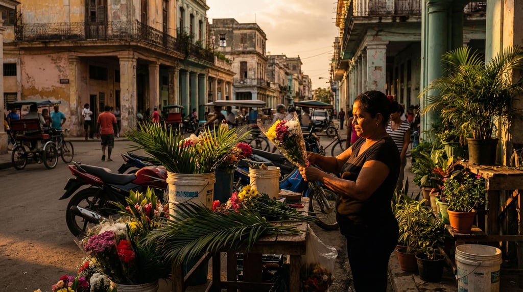 A flower seller arranging bouquets on a corner stall on a busy commercial avenue in a tropical city, late afternoon, warm raking sunlight creating dramatic shadows on surfaces, parked bicycles and scooters along the curb, authentic urban energy, hazy atmosphere, no borders no film frames no letterboxing,.