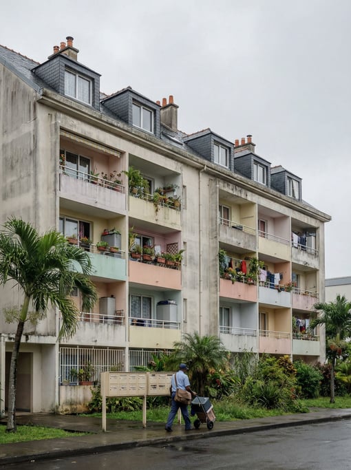 Social housing block with colorful balconies in a tropical neighborhood, dormer windows and chimney pots on the roofline, overcast midday, soft even diffused light with no harsh shadows, a mail carrier making deliveries, lived-in urban character, no borders no film frames no letterboxing,.