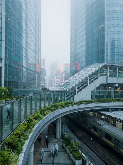 Elevated walkway between glass towers in a Tokyo, efficient urban design blending transit and public space, misty morning, soft diffused light through atmospheric haze, modern Asian urban character, no borders no film frames no letterboxing,.