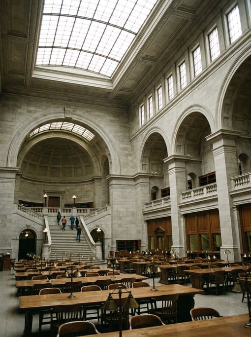 Grand reading room with rows of desks inside a historic courthouse, dramatic scale making people appear small, natural light from above, a few people ascending the stairs, architecture celebrating space and light, no borders no film frames no letterboxing,.