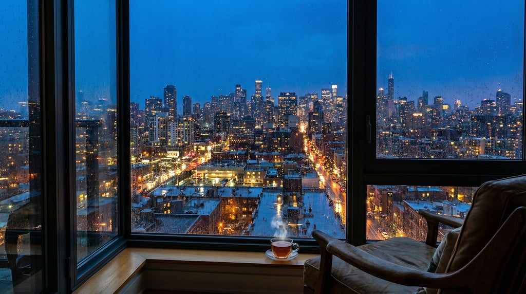 View through a large floor-to-ceiling apartment window overlooking a cosmopolitan cityscape at dusk, deep blue twilight with warm city lights emerging, the window frame creating a natural border, after a rain shower, contemplative urban moment, no borders no film frames no letterboxing,.
