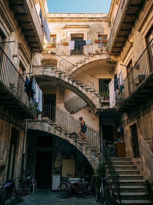 Looking up through a courtyard of a Sicilian palazzo, worn stone stairs spiraling up along the walls, late afternoon light hitting the upper floors while lower levels sit in cool shadow, everyday urban life, no borders no film frames no letterboxing,.