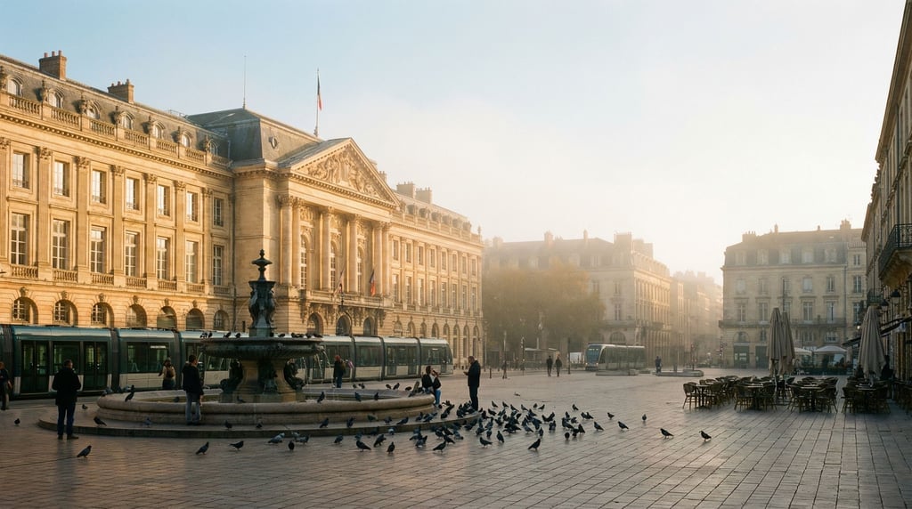 Wide civic square flanked by government buildings in a European city, pigeons gathered near the fountain, golden hour, warm amber light casting long shadows, light fog softening the background, civic grandeur at human scale, no borders no film frames no letterboxing,.