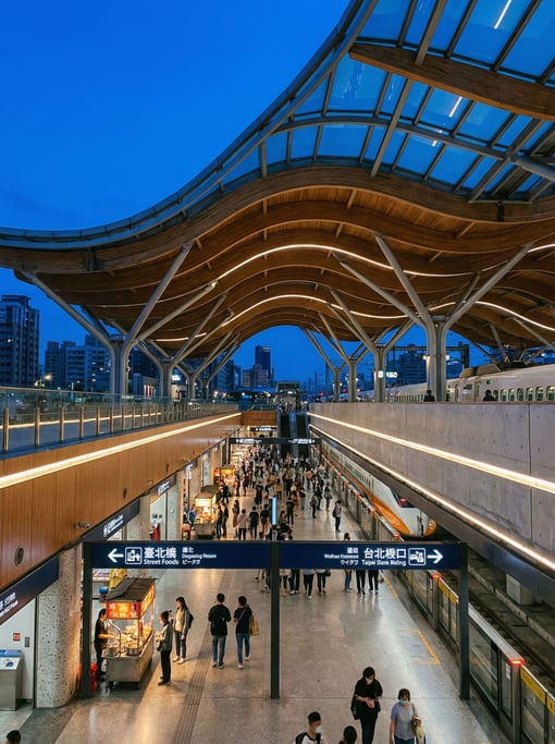 Modern transit hub with sweeping roof in a Taipei, clean modern surfaces with thoughtful wayfinding design, blue hour, deep cobalt sky with warm artificial lights below, modern Asian urban character, no borders no film frames no letterboxing,.