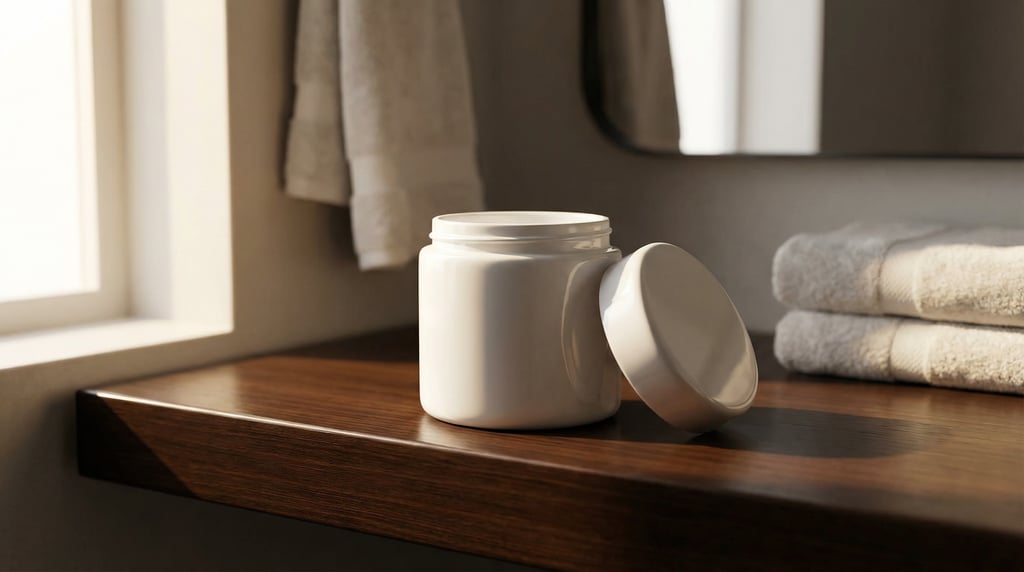 small round jar in glossy white, single with cap removed beside it, completely blank with no text labels or branding, bathroom shelf, dramatic side lighting, editorial product photography.
