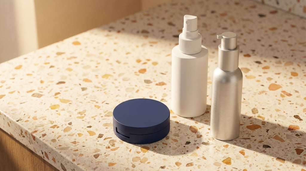 cosmetic compact in matte navy and spray bottle in matte white and pump dispenser bottle in brushed aluminum, arranged together on a terrazzo counter, all completely blank with no text labels or branding, warm golden light, editorial product photography.