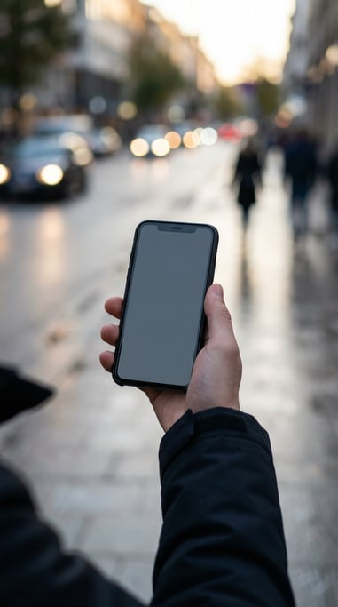 hand holding a smartphone with blurred city street behind, blank solid slate screen with no content or UI, shallow depth of field, editorial mockup photography.