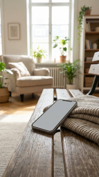 modern smartphone on a park bench, blank solid silver grey screen with no content or UI, cozy living room, bright even daylight, low angle looking up, editorial product photography.