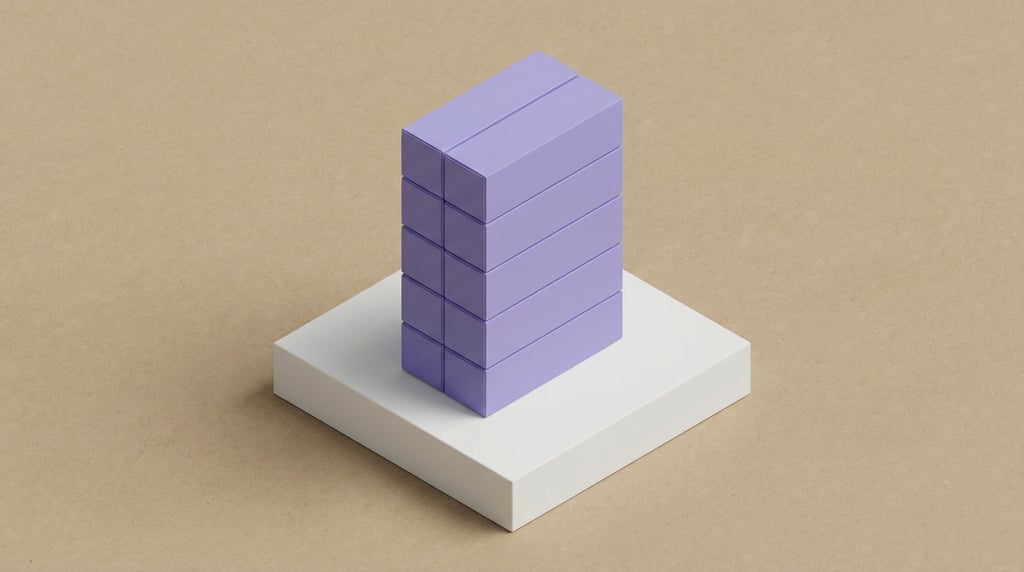 isometric view, tall narrow product box, boxes stacked vertically on a pedestal, matte lavender finish, all faces completely blank with no text or branding, kraft paper background, cool even ambient lighting, on a matte white isometric platform, clean shadowless studio light, isometric 3D render style, clean vector-like perspective, editorial product photography.