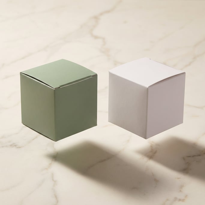 cube-shaped box, single box floating with shadow below, each a different color — matte sage green, matte white —, all faces completely blank with no text or branding, pale marble surface, warm directional side light, editorial product photography.