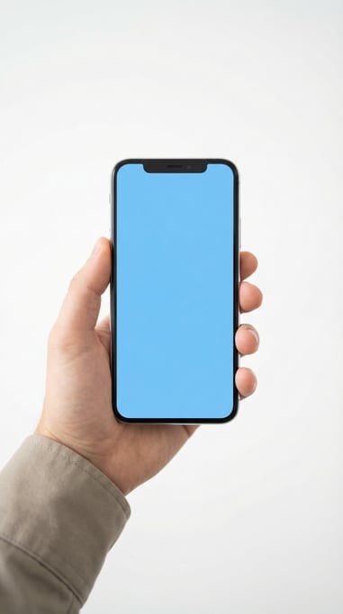 hand holding a modern smartphone against a clean white studio background, blank solid sky blue screen with no content or UI, shallow depth of field, editorial mockup photography.
