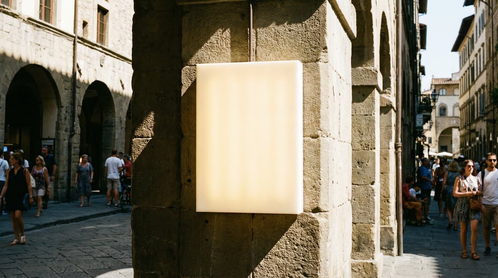 backlit lightbox sign on a stone column, sign face completely blank illuminated warm white with no text logos or graphics, bright midday sun with sharp shadows, architectural context visible, editorial signage mockup photography.