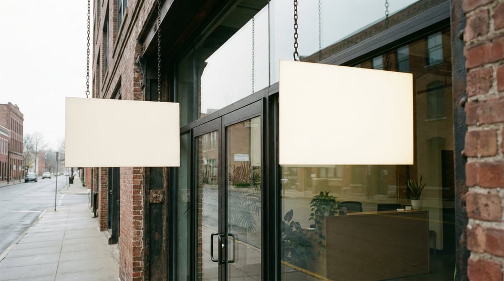 rectangular hanging sign beside a glass entrance door, sign face completely blank solid warm white with no text logos or graphics, soft north light, wide shot with building context, editorial signage mockup photography.