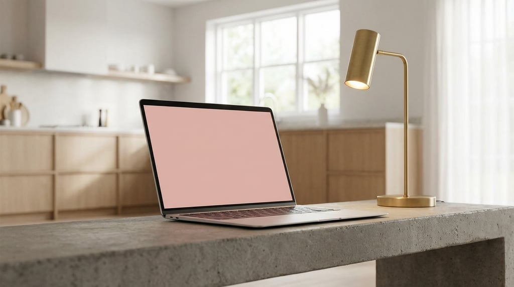 thin modern laptop on a concrete bench, blank solid blush pink screen with no content or UI, bright kitchen, soft natural window light, low angle looking up, brass desk lamp beside, editorial product photography.