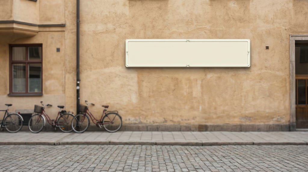 neon-style sign on a stucco building wall, sign face completely blank solid ivory with no text logos or graphics, soft natural daylight, from across the street, editorial signage mockup photography.