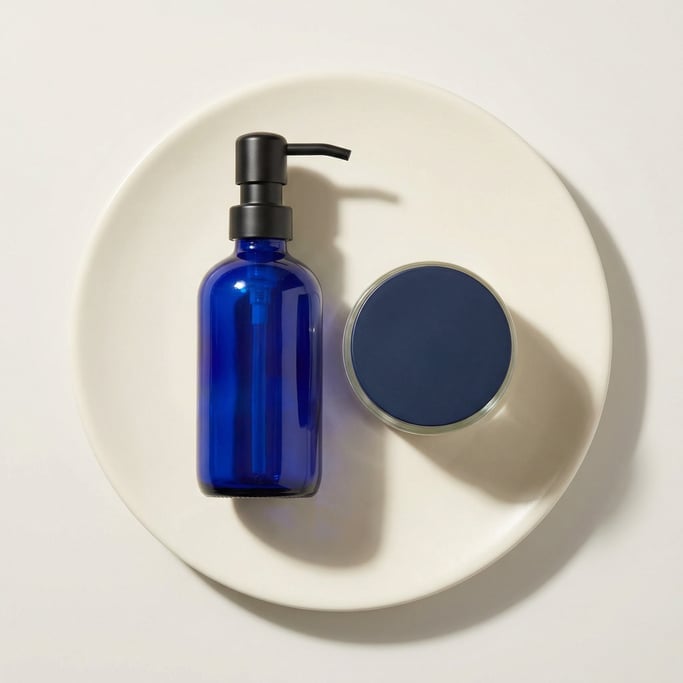 lotion pump bottle in cobalt blue glass and round glass bottle with cap in matte navy, arranged together on a smooth ceramic surface, all completely blank with no text labels or branding, overhead lighting with gentle shadows, editorial product photography.