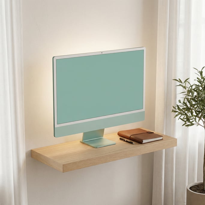 Modern all-in-one computer on a floating shelf, blank solid seafoam screen with no content or UI