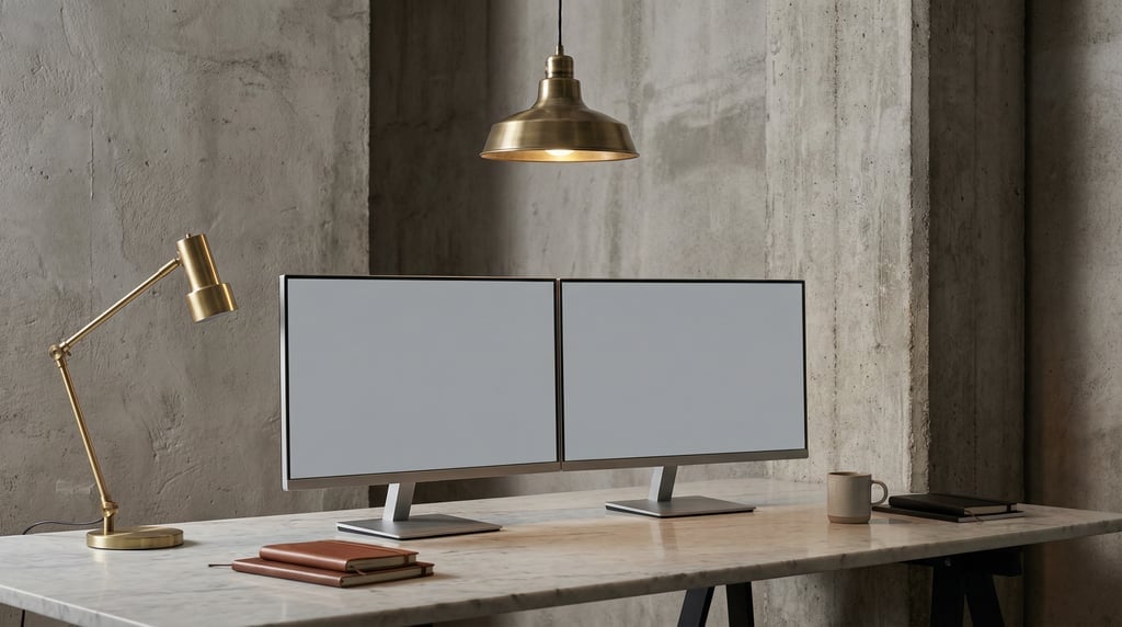 dual monitor setup on a pale marble surface, blank solid dove grey screen with no content or UI, brutalist concrete interior, single pendant light overhead, three-quarter angle, brass desk lamp beside, editorial product photography.