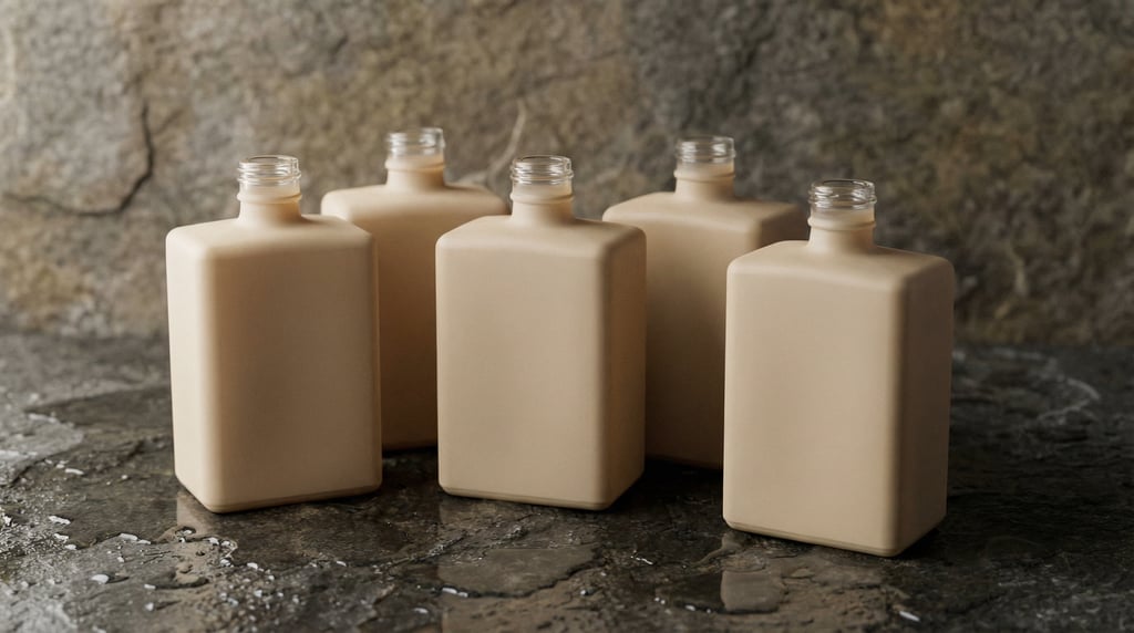 square glass bottle in matte sand, group of five arranged casually, completely blank with no text labels or branding, wet stone surface with water droplets, soft studio lighting, editorial product photography.
