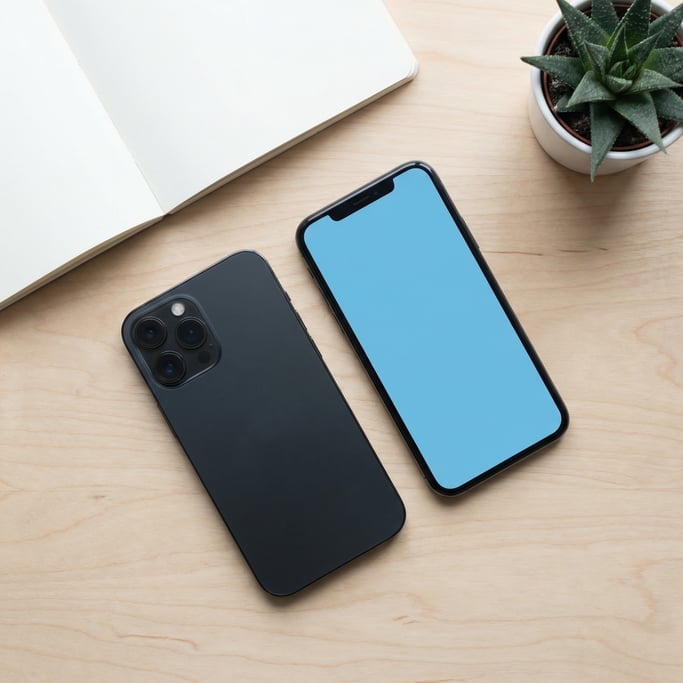 smartphone face down showing back on a light birch desk, blank solid arctic blue screen with no content, overhead flat lay perspective, soft north-facing window light, minimal editorial mockup photography.