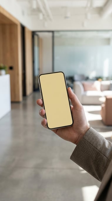 Hand holding a slim smartphone in a modern office lobby