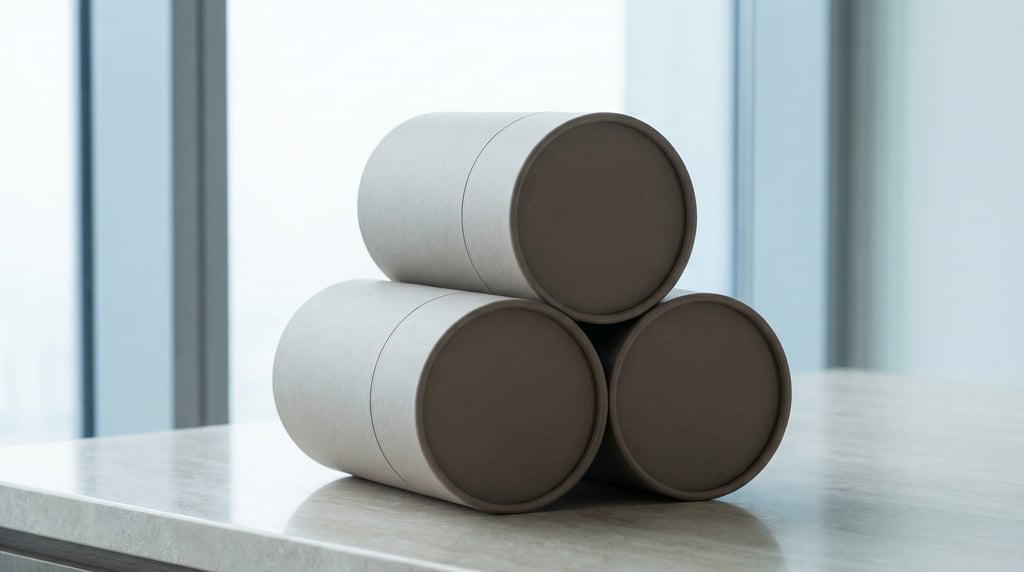 Cylinder tube packaging, pyramid of three boxes, matte warm grey finish