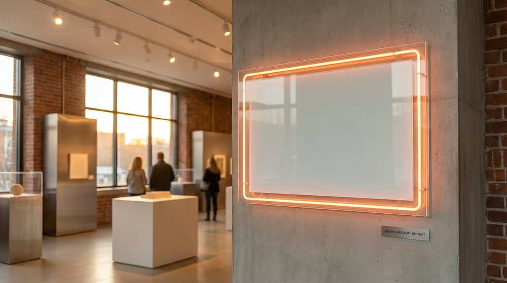 neon-style sign in a bright gallery-style interior, sign face completely blank frosted white with no text logos or graphics, warm evening glow from interior lights, architectural context visible, editorial signage mockup photography.