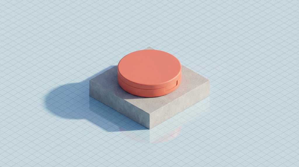 isometric view, cosmetic compact in matte coral, single with reflection below, completely blank with no text labels or branding, concrete pedestal, soft diffused natural light, on a pale blue isometric surface, gentle shadow cast to the lower right, isometric 3D render style, clean vector-like perspective, editorial product photography.